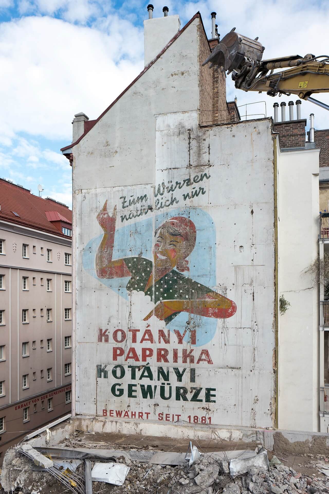 The cover photo of the book was taken during a dramatic operation involving a Kotanyi advertisement from the 1950s that had been temporarily exposed during demolition work. Excavator operator Robert Hasler uncovered it with extreme caution, while Austria's national broadcaster ORF reported live.