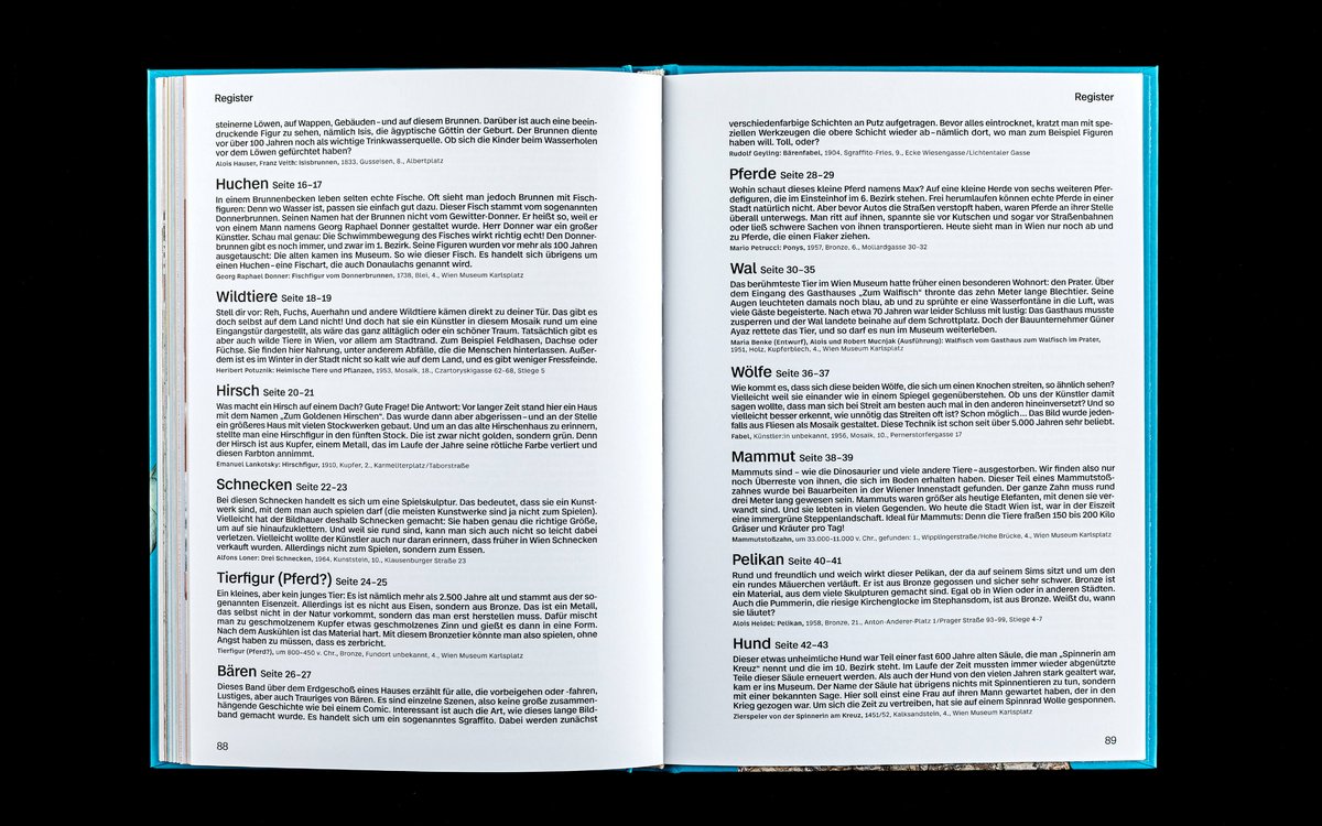 Dogs, pigeons and rats are typical city animals. But Vienna is also home to crocodiles, whales and water buffalo! You encounter them everywhere — whether as pictures on walls, house signs or sculptures outdoors and in museums. This city exploration in forty poems by children’s book author Michael Hammerschmid received the Austrian State Prize in 2024.