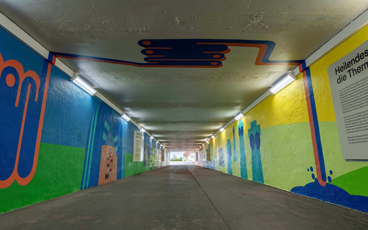 Favoriten is the largest of Vienna’s 23 districts and would be Austria’s second largest city in terms of population. On its outskirts lies the historic district of Oberlaa with its popular thermal baths and the site of the 1974 Vienna International Garden Show (WIG 74), now a spacious park. The Kästenbaum Tunnel connects the historic district of Oberlaa with the Therme Wien thermal baths and the Oberlaa spa gardens. The almost 100-metre-long tunnel between rural and urban areas was long considered an unsightly and frightening place. On the occasion of a whole series of anniversaries (700 years of Oberlaa, 150 years of Favoriten and 50 years of the Vienna International Garden Show), WSE (Vienna’s City Development Company) commissioned me to redesign the tunnel.