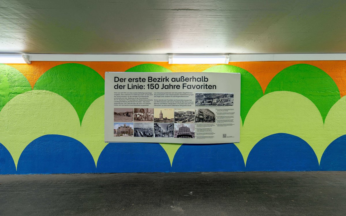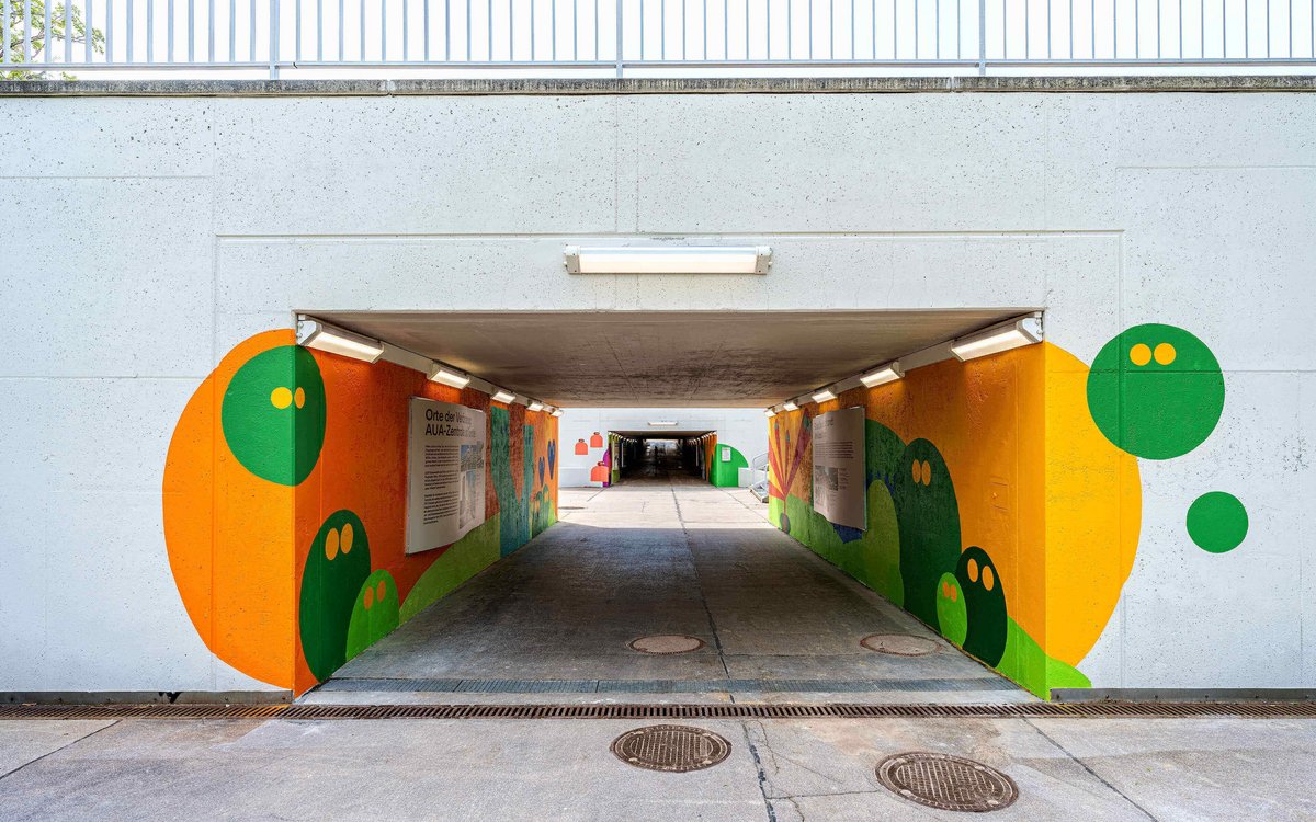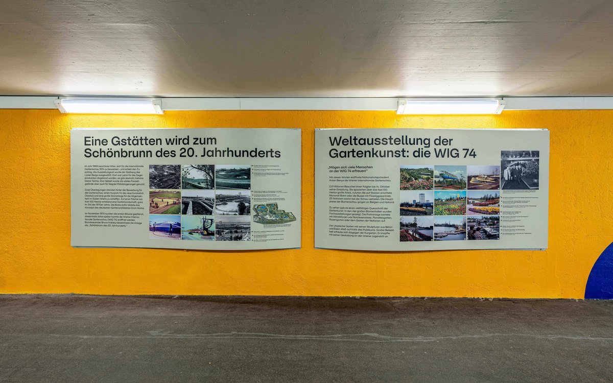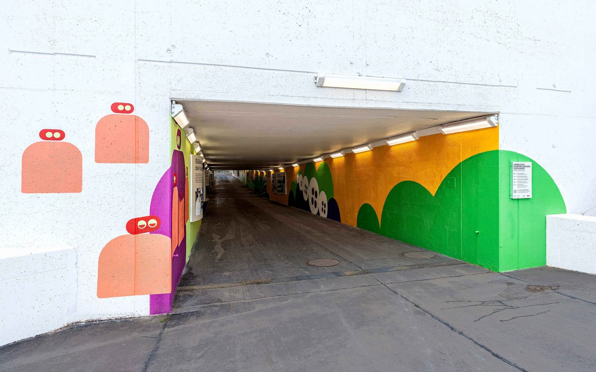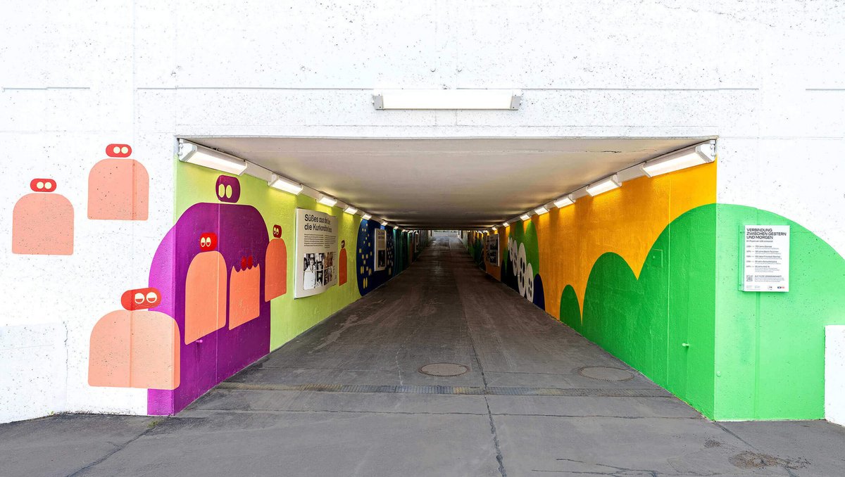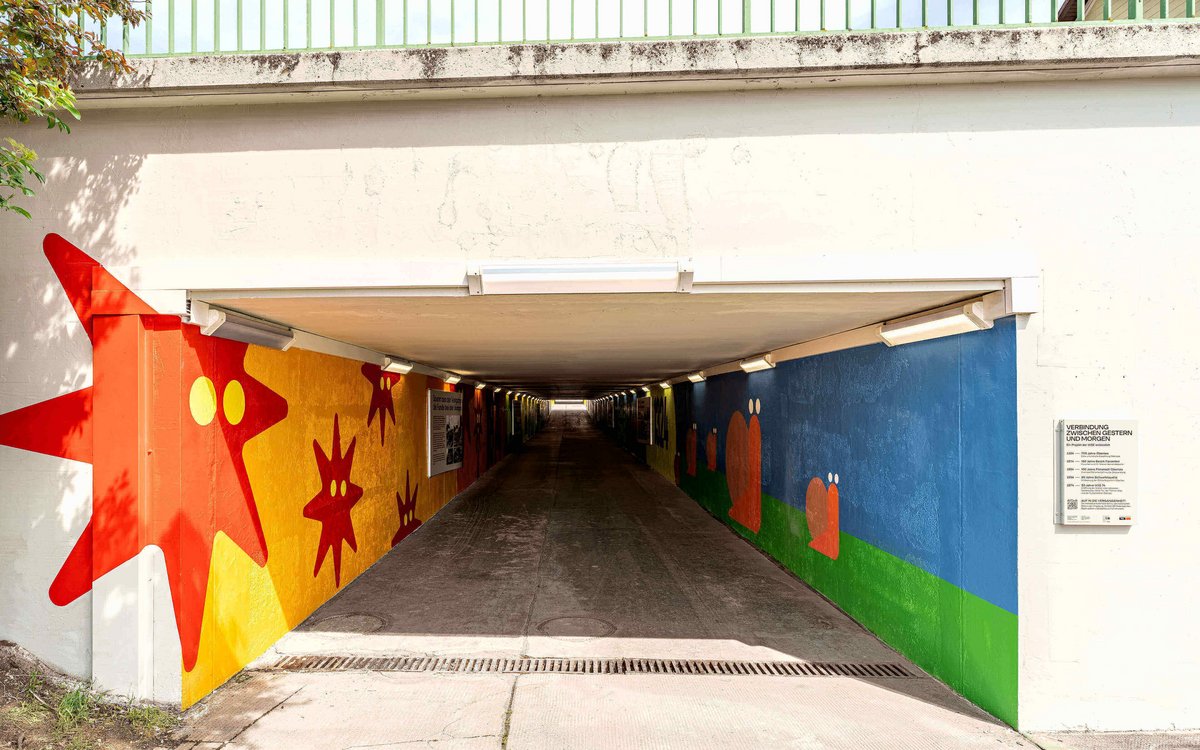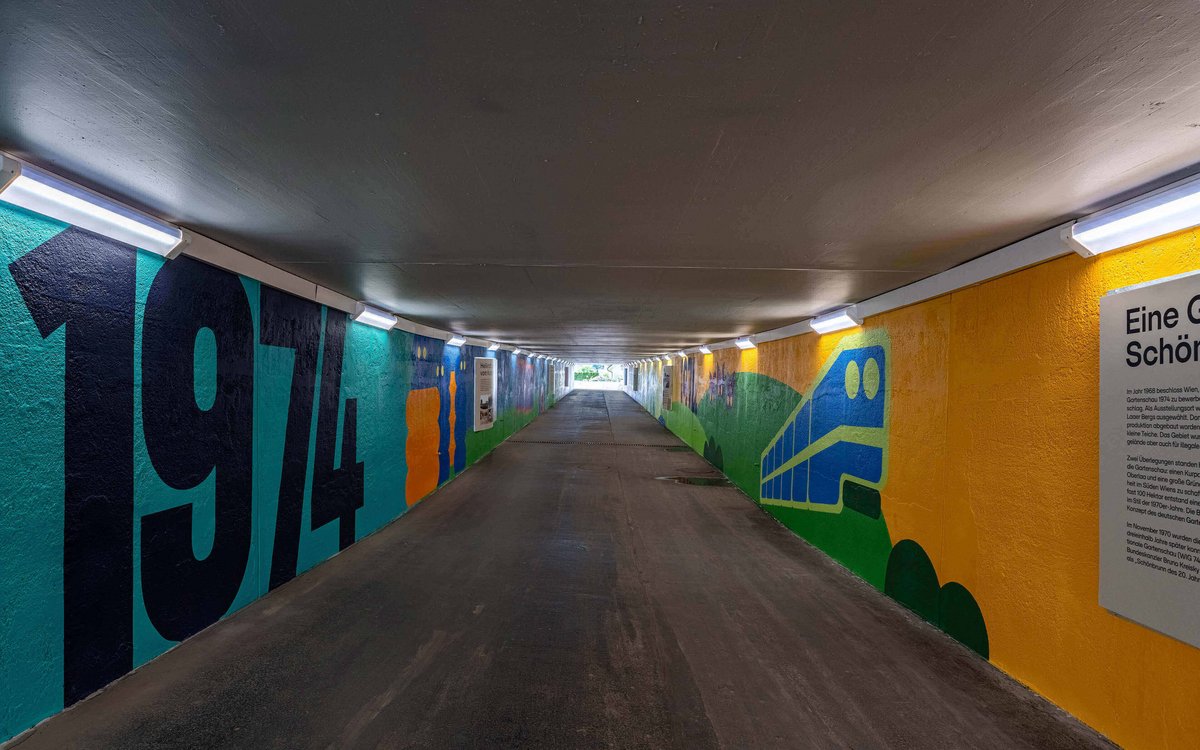 On 18 April 2024, the time had come. Exactly 50 years to the day after the opening of the WIG 74, the exhibition and redesign of the tunnel were presented to the public. Twelve displays with around 100 images tell the story of the eventful history of this place between city and countryside, between yesterday and tomorrow. The design of the tunnel takes up motifs from the “exhibition in passing” in an abstract form and transforms the former “place of fear” into the “most colourful tunnel in Europe”.