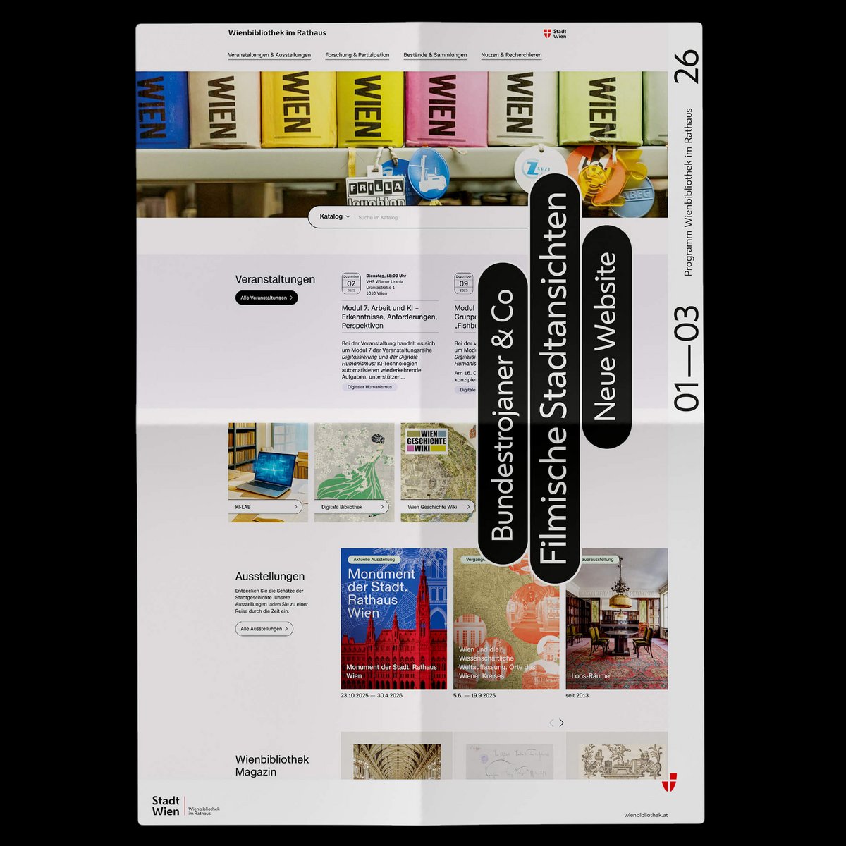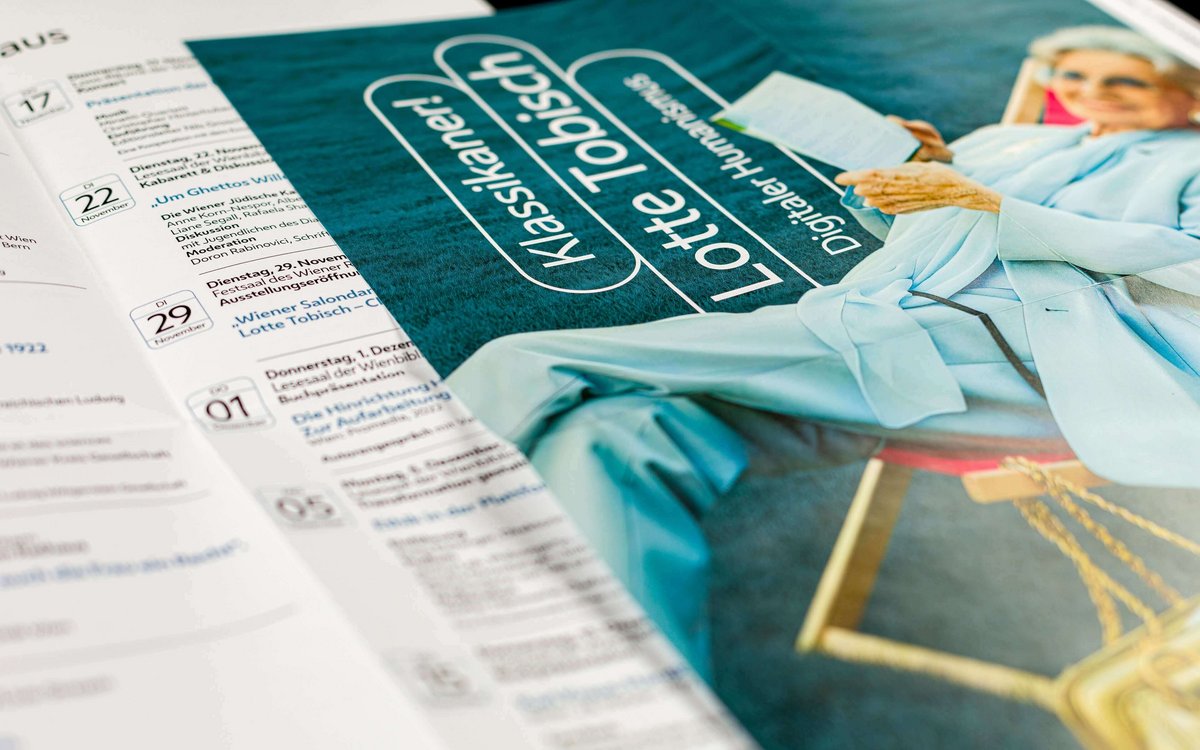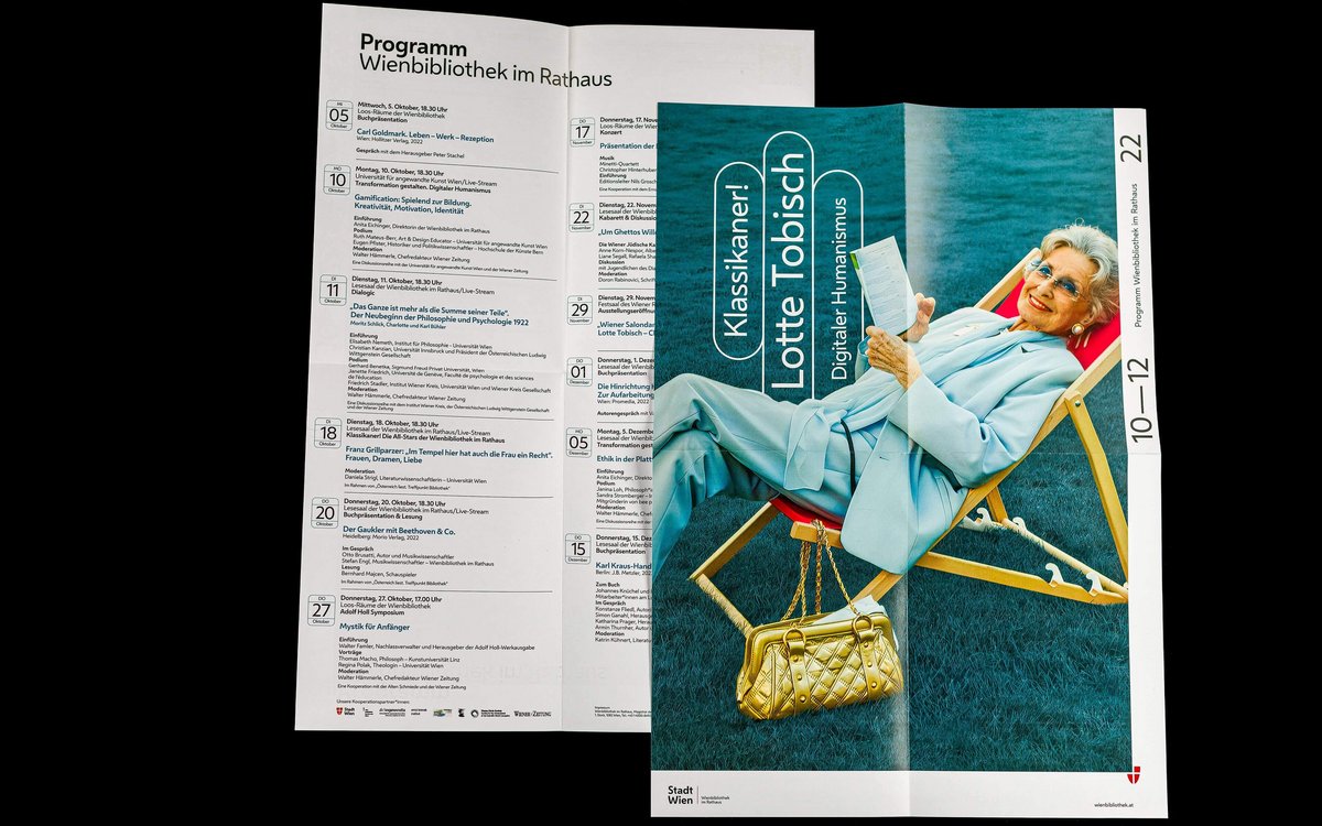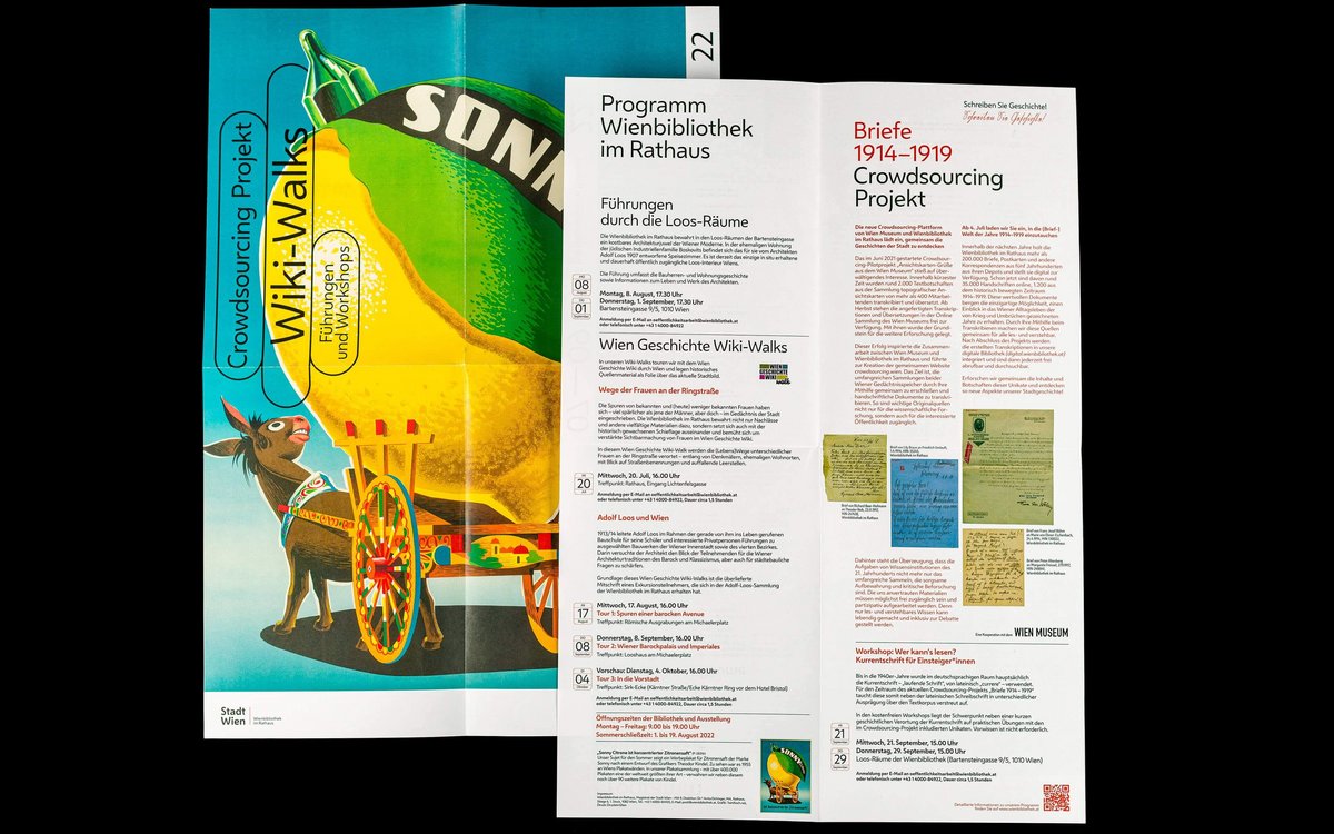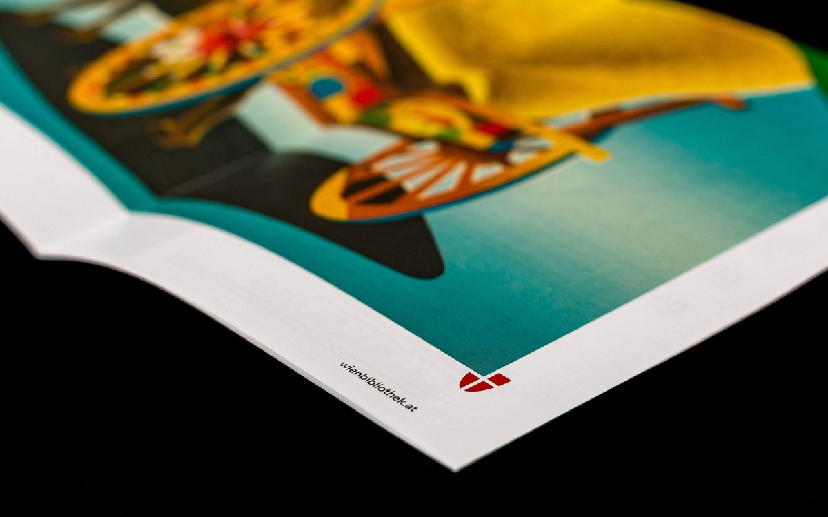 The covers of the quarterly programmes in fold-out poster format convey the diversity of the collections in this ‘repository of knowledge of the city’. The same motifs are also featured in large format in the onsite branding of the Vienna Library in Town Hall.