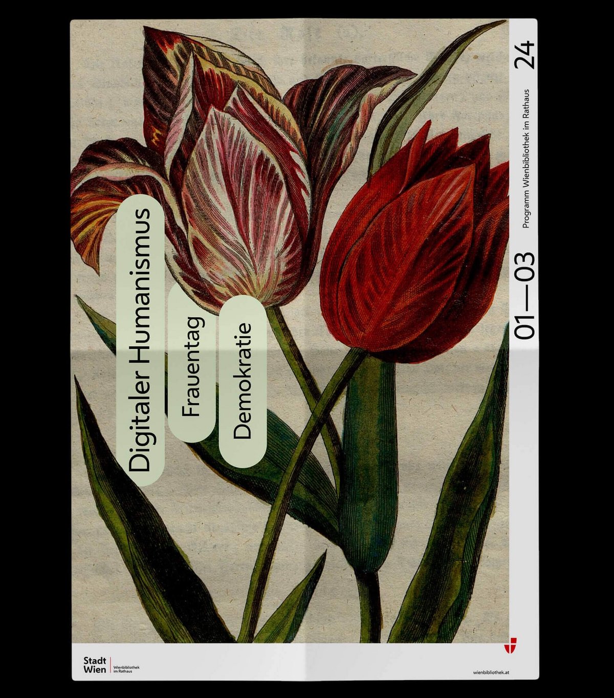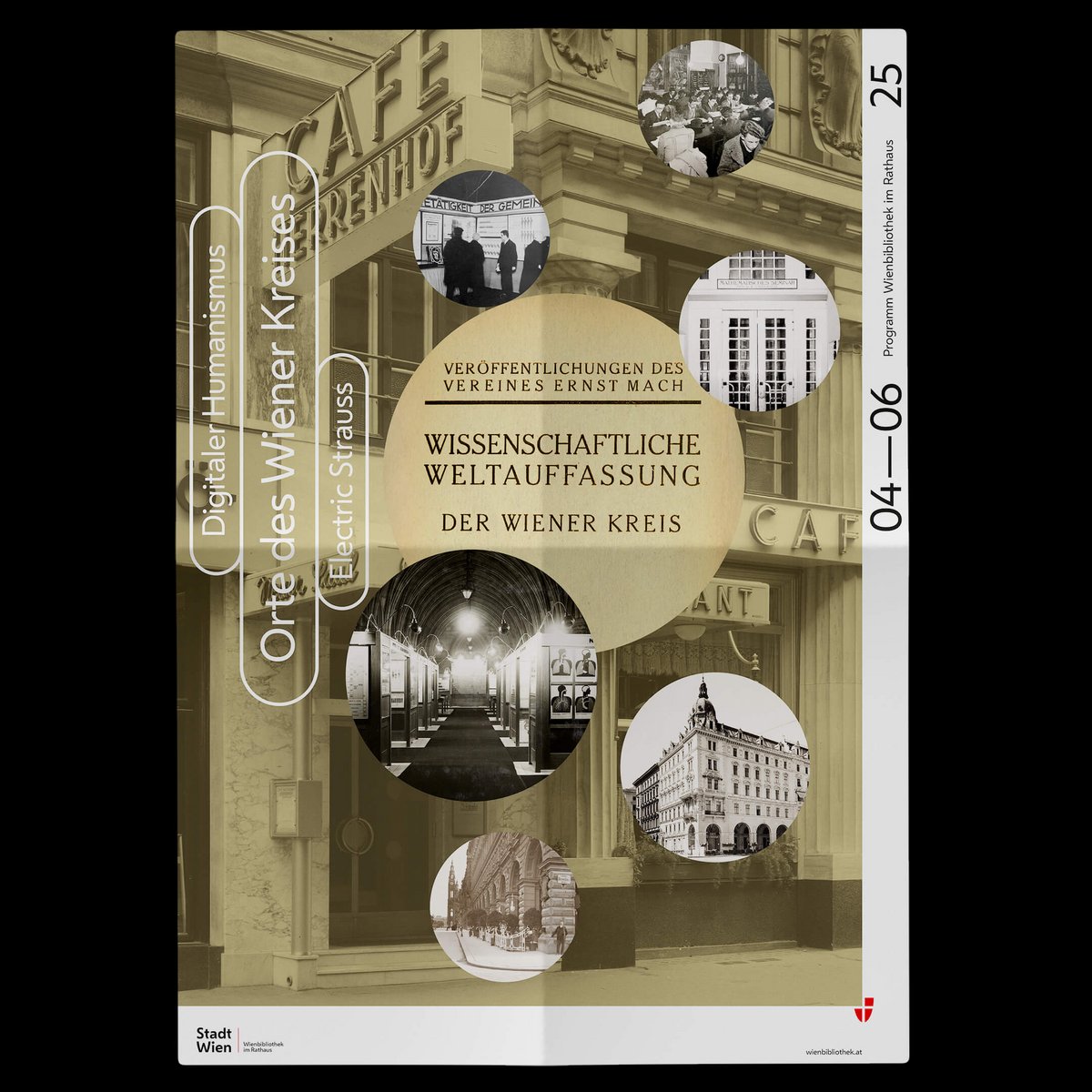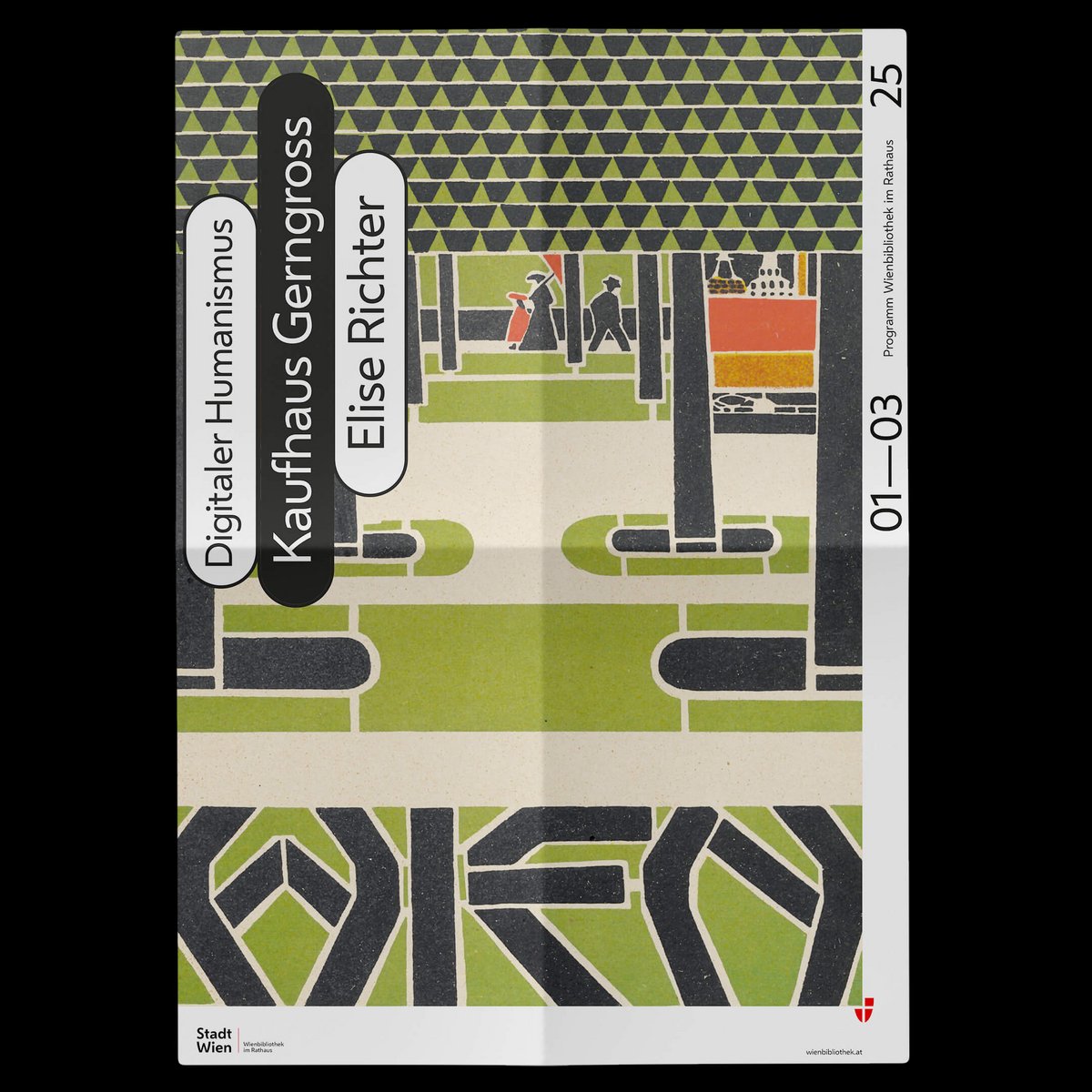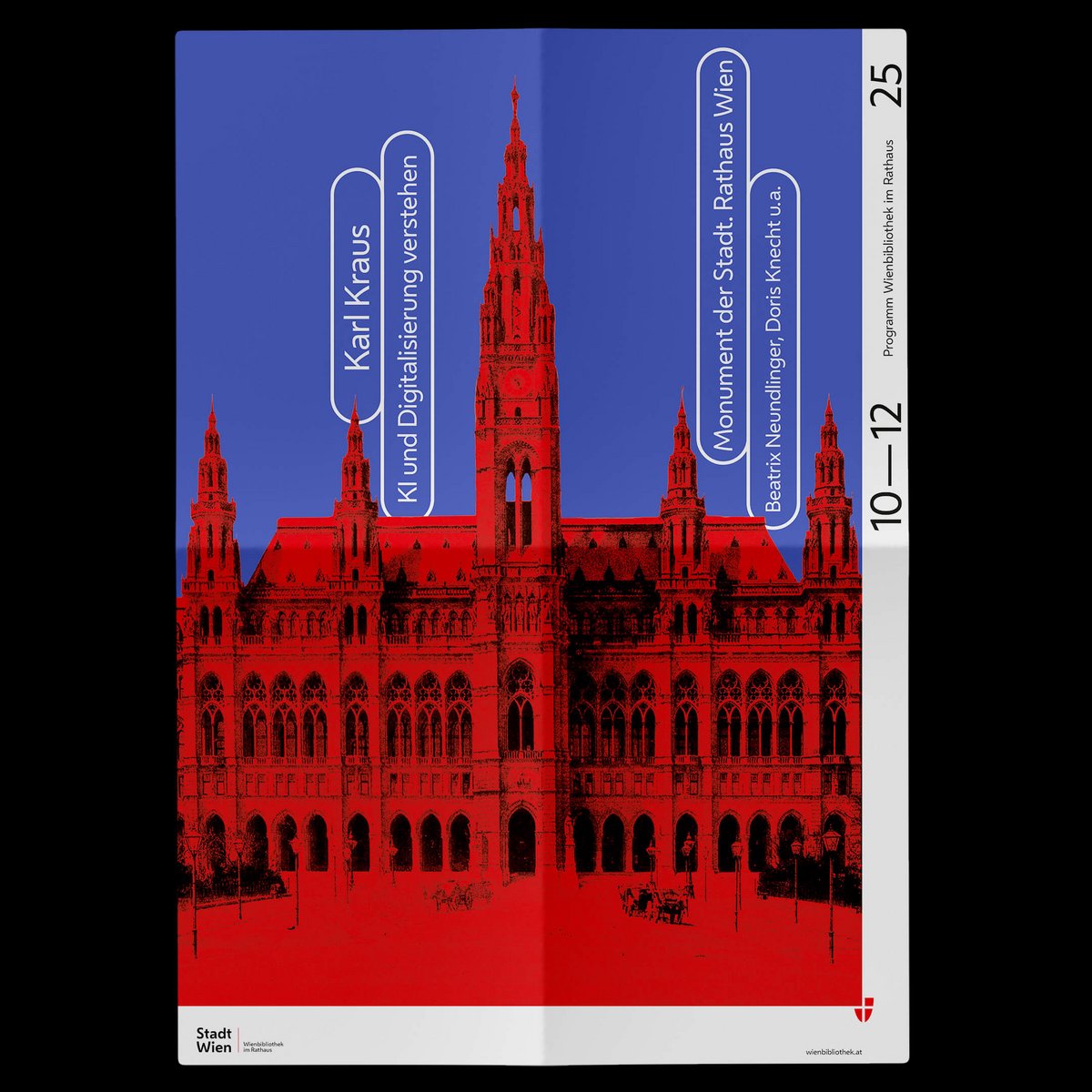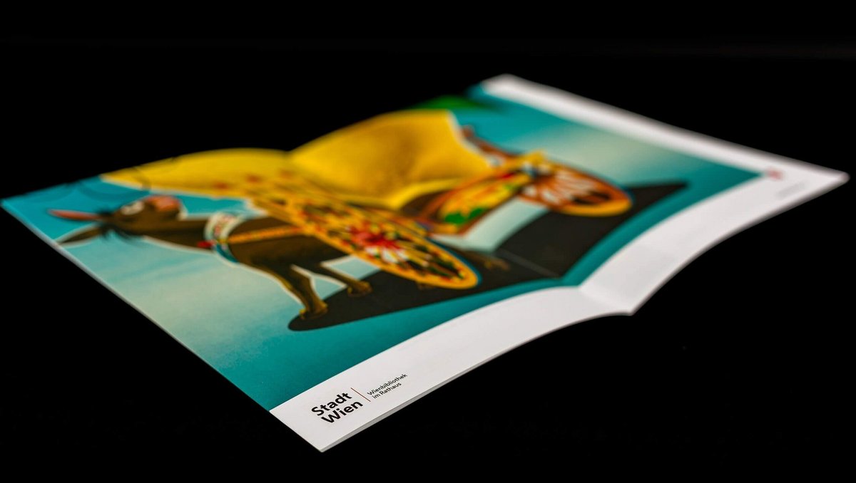The covers of the quarterly programmes in fold-out poster format convey the diversity of the collections in this ‘repository of knowledge of the city’. The same motifs are also featured in large format in the onsite branding of the Vienna Library in Town Hall.