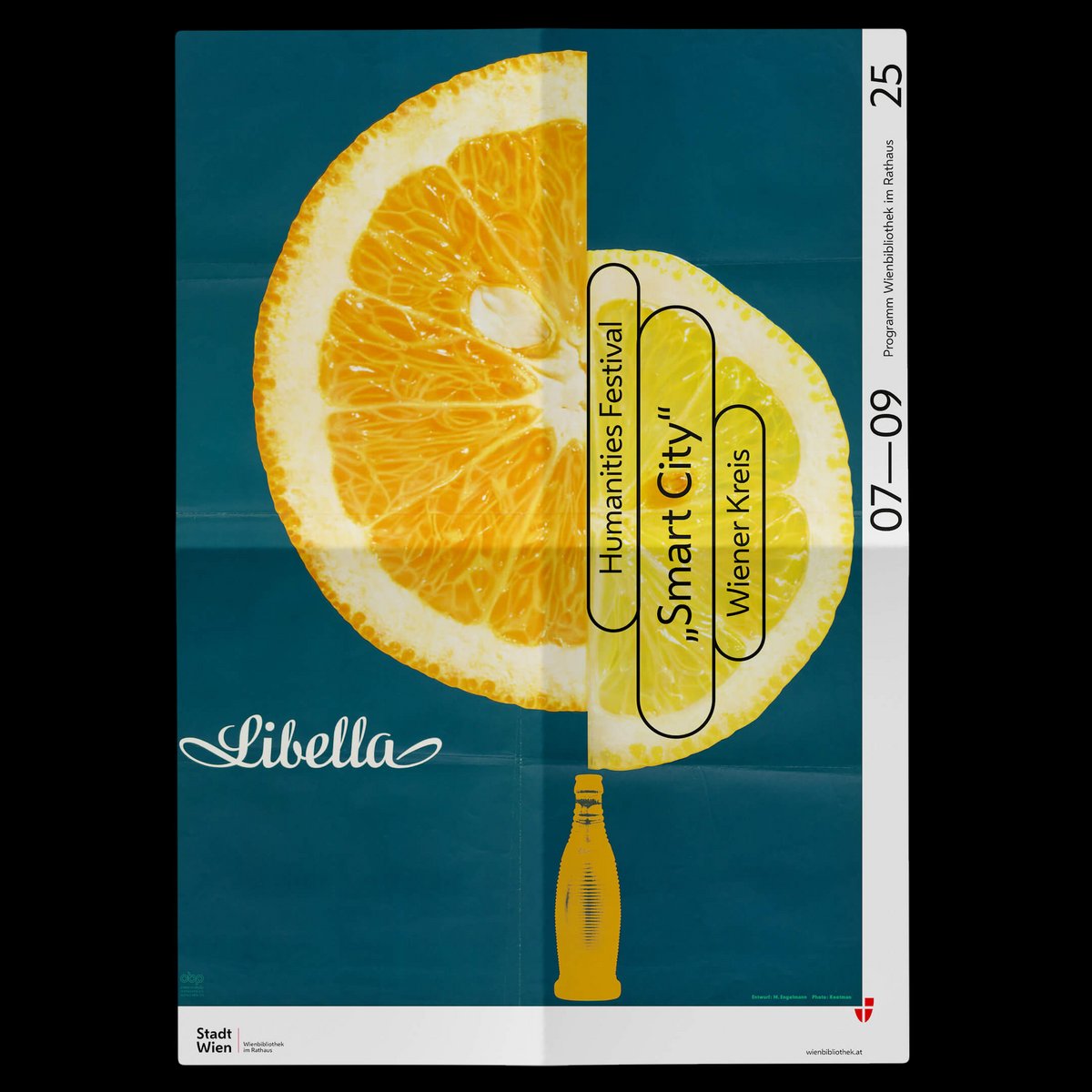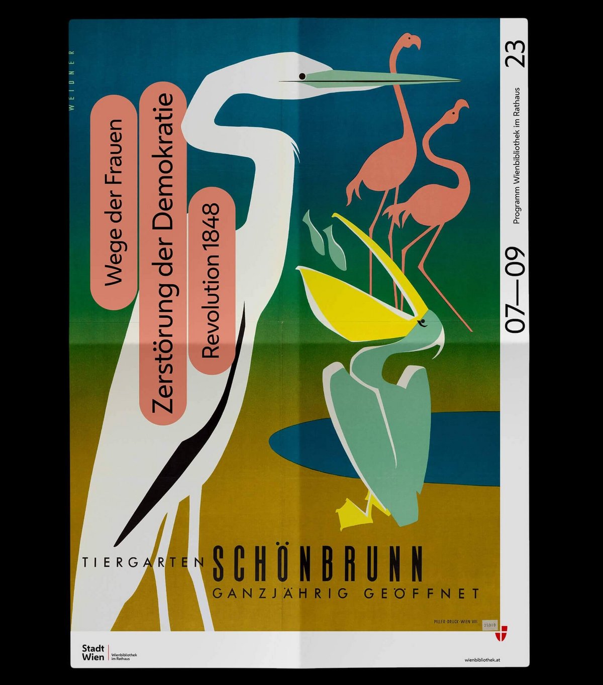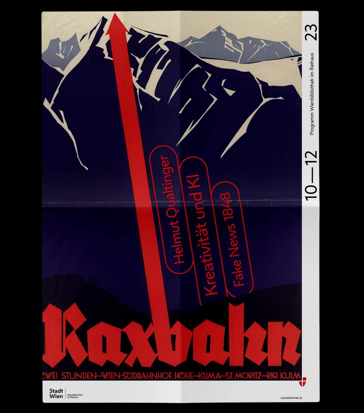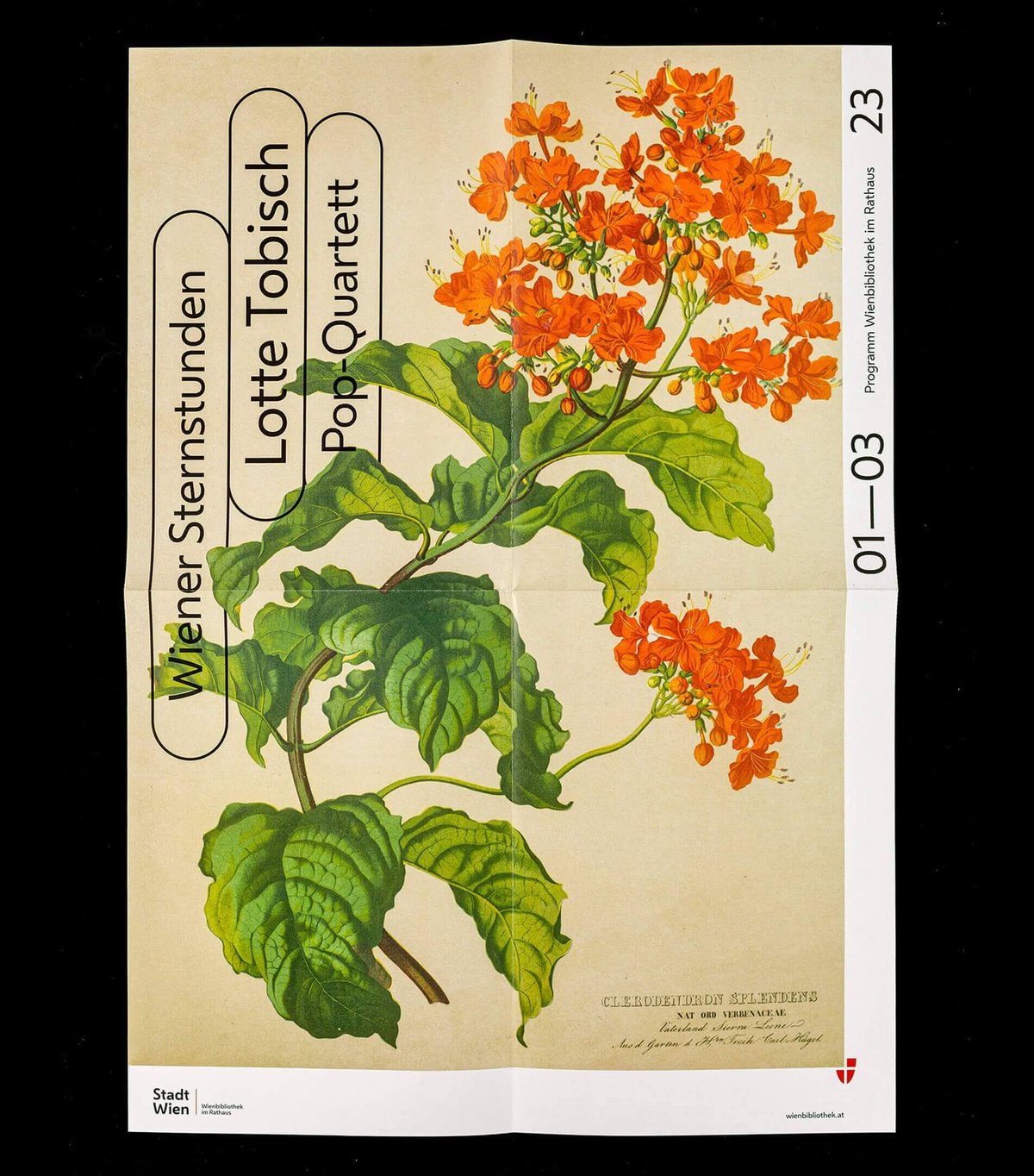 The covers of the quarterly programmes in fold-out poster format convey the diversity of the collections in this ‘repository of knowledge of the city’. The same motifs are also featured in large format in the onsite branding of the Vienna Library in Town Hall.