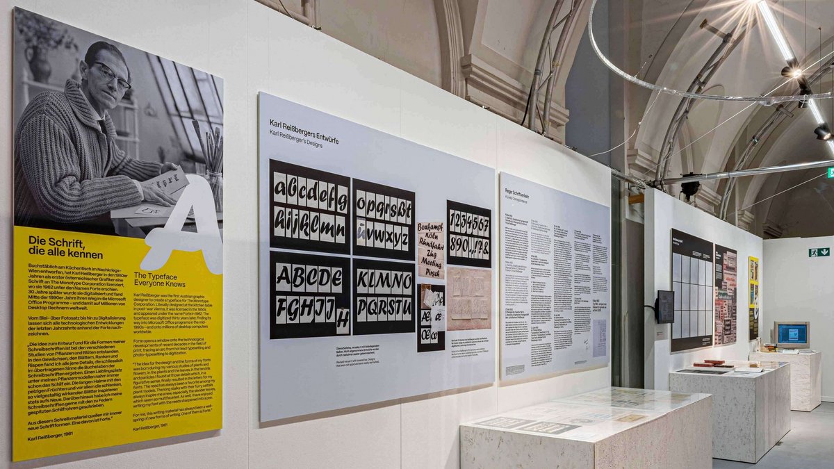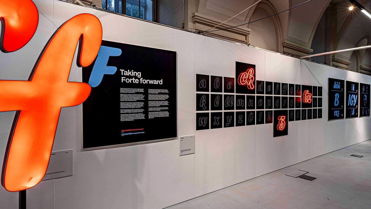 To mark the anniversary, Microsoft released a version of the typeface revised by Toshi Omagari under the title Forte Forward. In addition to revisiting Karl Reißberger’s work, this new edition made it possible to devote part of the exhibition to the future development of the typeface.The exhibition concluded with the presentation of artistic interpretations by 31 international creatives.